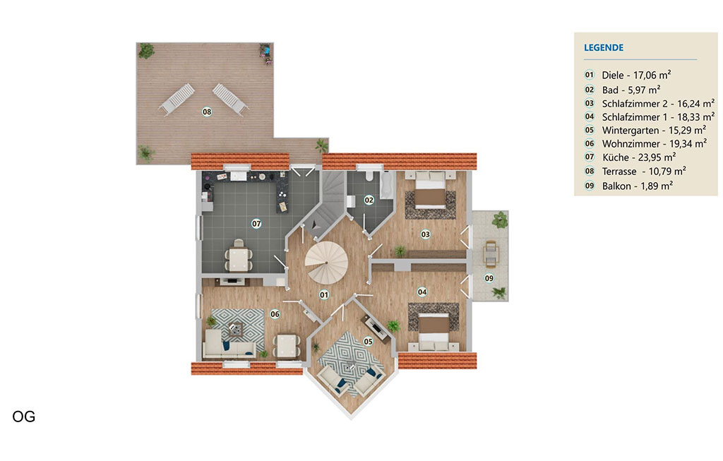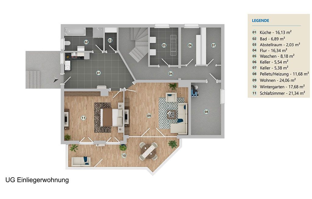 Die Mustermöblierung ist nicht im Preis inbegriffen. Die Möblierung dient nur als Einrichtungsvorschlag. Für Richtigkeit und Vollständigkeit wird keine Haftung übernommen. Änderungen, Irrtum und Zwischenverkauf bleiben vorbehalten.