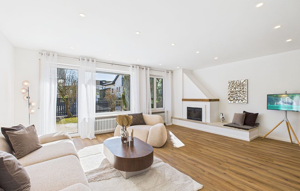 Diese im Jahr 1975 errichtete Doppelhaushälfte wurde mit viel Sorgfalt umfassend modernisiert und präsentiert sich heute als stilvolles Zuhause mit rund 189 m2 Wohnfläche auf drei Ebenen – großzügig, hell und zeitgemäß.