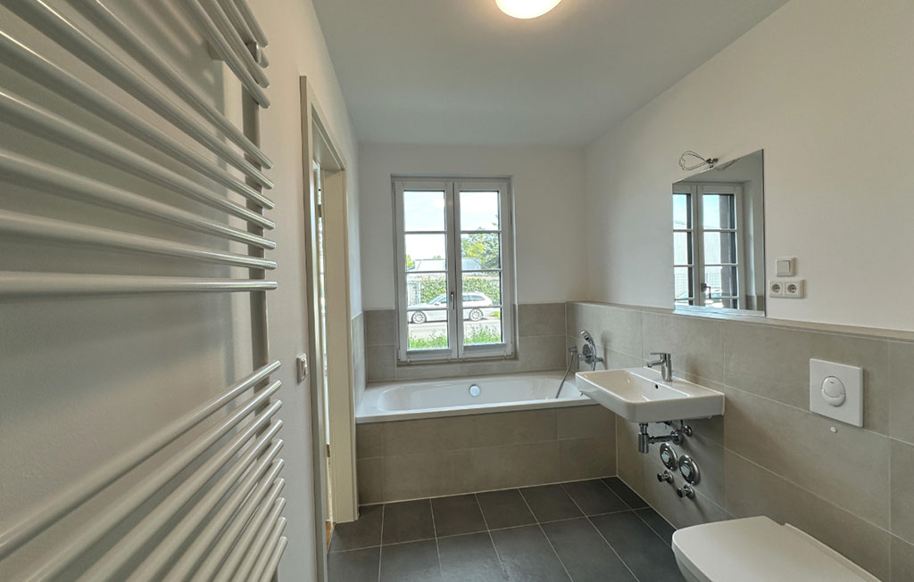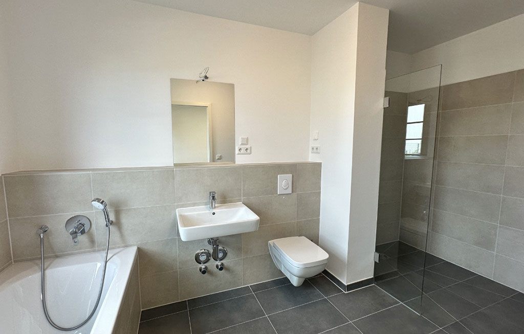 – En-suite Tageslichtbad mit Badewanne, bodengleicher Dusche und eleganter Ausstattung